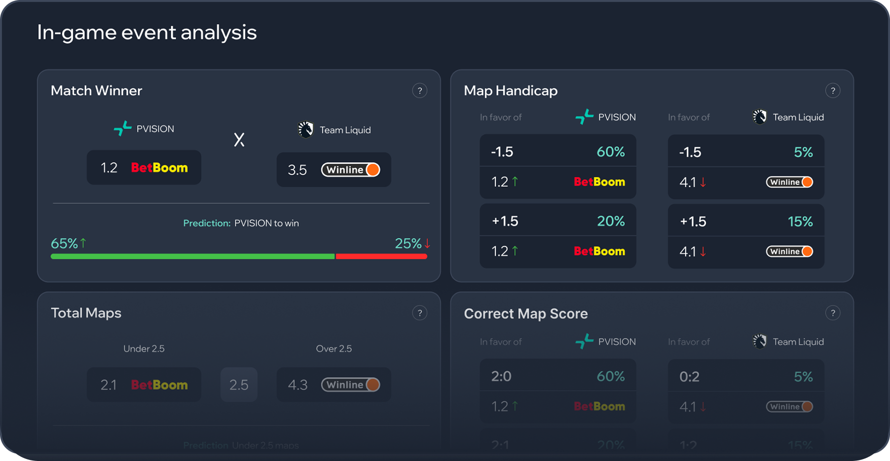 We cover all key events: match winner, total maps, map handicap, exact score, and individual map outcomes. For CS2, round handicaps and totals are also available. We are constantly expanding the list of available events!
